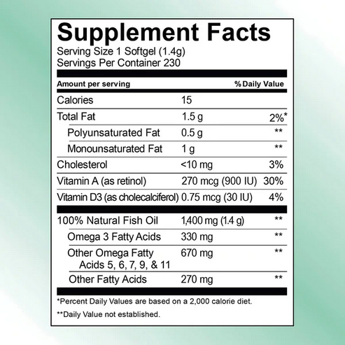 Key Nutrients: 330 mg Omega-3s (EPA+DHA), 670 mg other Omega fatty acids, Vitamins A & D, Astaxanthin